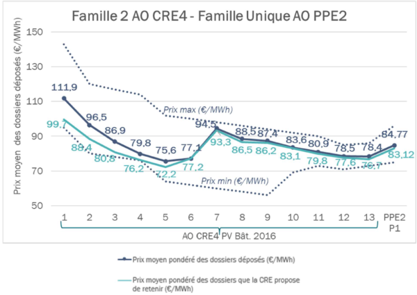 Par ailleurs, le prix moyen pondéré de l’ensemble des dossiers, volume réservé inclus, s’est élevé à 83,12 €/MWh. Quant au prix moyen pondéré des dossiers du volume réservé, il s’est élevé à 86,53 €/MWh. Face au faible nombre de candidats, la CRE a appliqué la règle de compétitivité, ce qui a permis de modérer la nette augmentation du prix moyen pondéré des dossiers retenus par rapport à celui constaté pour la famille 2 de la treizième période du précédent appel d’offres (+6,5 €/MWh). Au final, cette règle a permis de diminuer le prix moyen pondéré de 2,06 €/MWh, ce qui est de 8 % supérieur au prix moyen pondéré observé à la treizième période du précédent appel d’offres et de 15 % par rapport au prix le plus bas observé dans le cadre du précédent appel d’offres (5ème période).