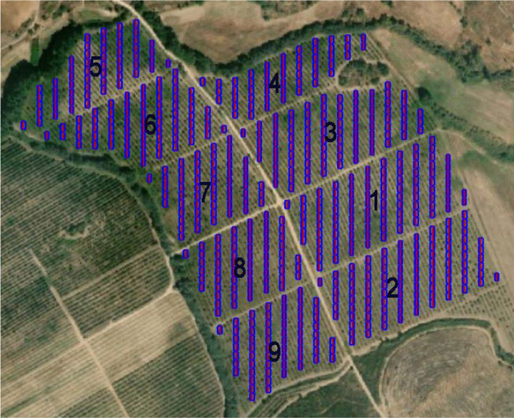 Pour la disposition du projet PV à espacement, une distance de 20 mètres a été retenue, créant un espace minimum de 15 mètres entre les deux rangées de huit modules chacune, pour un total de 16 modules. Les modules avaient un angle d’inclinaison de 55 % à -55 %, et des trackers ont été utilisés pour suivre le mouvement du soleil et optimiser la production d’énergie. Dans la configuration du champ photovoltaïque en hauteur, les 16 modules ont été installés sur une seule rangée afin de réduire l’ombre portée sur les cultures situées en dessous. Là encore, un angle d’inclinaison de 55 % à -55 % a été choisi, à l’aide de trackers. Cependant, dans cette installation, le terrain a créé trop d’ombres, de sorte que l’angle d’inclinaison a été ajusté à 45% et -45%.
