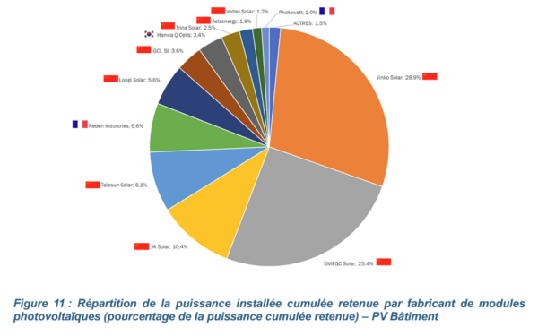Les porteurs de projet retenus ont indiqué avoir sélectionné 17 fabricants de modules photovoltaïques différents (dont un non identifié). Pour le segment du PV au sol, les trois fabricants chinois Jinko, JA Solar et DMEGC représentent plus de la moitié de la puissance à venir.