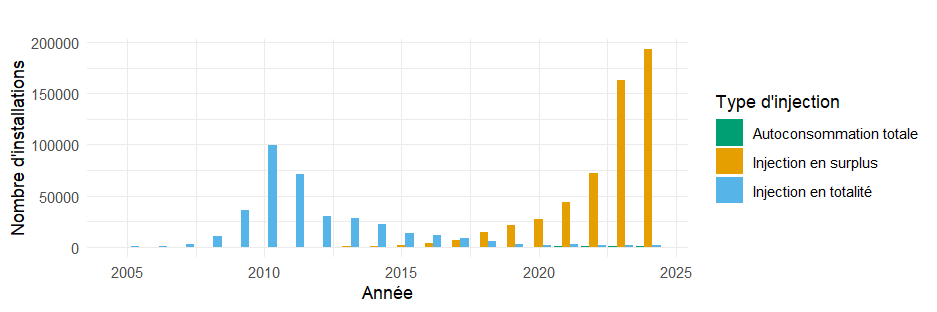 Le choix de valorisation de l’électricité produite est central dans les projets photovoltaïques car il est au cœur du schéma de rentabilité de l’installation. Alors qu’historiquement, le choix se tournait essentiellement vers les installations avec injection totale de la production dans le réseau, ce type de modèle est de moins en moins adopté au profit d’installations avec autoconsommation partielle ou totale. Plus précisément, l’observation de l’évolution des installations photovoltaïques en France depuis le milieu des années 2000 révèle deux grandes vagues d’adoption. La première, autour de l’année 2010, correspond presque uniquement à des installations avec injection totale de la production. La seconde, amorcée en 2022 dans le contexte de la crise énergétique européenne, se caractérise au contraire par une prédominance des installations en autoconsommation.
