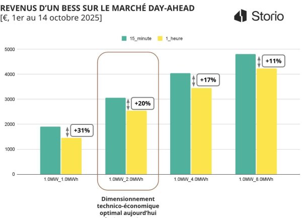 Depuis le 1er octobre, le marché spot de l’électricité, marché de gros sur lesquels les prix sont fixés la veille pour le lendemain, affiche un prix toutes les 15 minutes plutôt que toutes les heures. Storio Energy, acteur du stockage par batterie en BtoB, a analysé l’impact de ce changement sur les revenus d’une batterie cherchant à “arbitrer” ce marché, c’est-à-dire en se chargeant lorsque les prix sont bas pour restituer son énergie quand les prix sont élevés. En se basant sur les données du 1er au 14 octobre, il en ressort une hausse de 20% de revenus, pour une batterie disposant de 2h de profondeur (par exemple 10 MW de puissance et 20 MWh de capacité).
