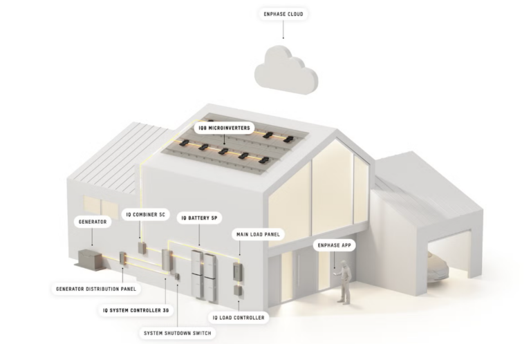 Le système comprend la batterie IQ 5P avec micro-onduleurs intégrés formant le réseau, la série de micro-onduleurs IQ8 avec la fonction Sunlight JumpStart, et un générateur de secours à courant alternatif tiers. Ces composants travaillent ensemble pour alimenter les charges et recharger les batteries efficacement, avec un logiciel intelligent optimisant l’utilisation du générateur lorsque cela est nécessaire et empêchant tout dommage au générateur causé par un retour de courant.