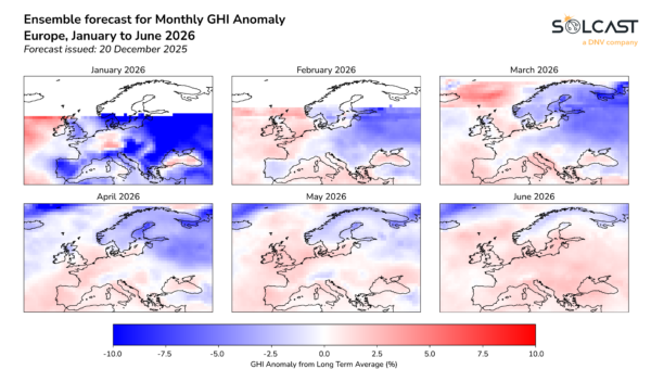 Selon l’analyse de Solcast, le premier semestre 2026 s’annonce marqué par une forte hétérogénéité des conditions solaires à l’échelle mondiale. Les prévisions saisonnières de plusieurs agences météorologiques laissent présager un début d’année difficile pour les exploitants solaires en Europe, tandis que les premiers signaux indiquent un début d’été ensoleillé. La situation est inverse aux États-Unis, où des anomalies négatives généralisées sont prévues en février, mars et avril, après un mois de janvier particulièrement favorable. Presque tous les scénarios anticipent, pour l’Australie, un premier semestre 2026 globalement positif, avec notamment un mois de janvier très dégagé, correspondant au pic estival, tandis que la majeure partie de l’Asie devrait connaître des conditions plus nuageuses que la normale. L’est de la Chine, en revanche, devrait bénéficier de conditions plus clémentes. La variabilité de l’ENSO ajoute un niveau de complexité supplémentaire, avec des conditions neutres attendues en début d’année, avant un possible basculement vers un épisode El Niño plus tard en 2026.