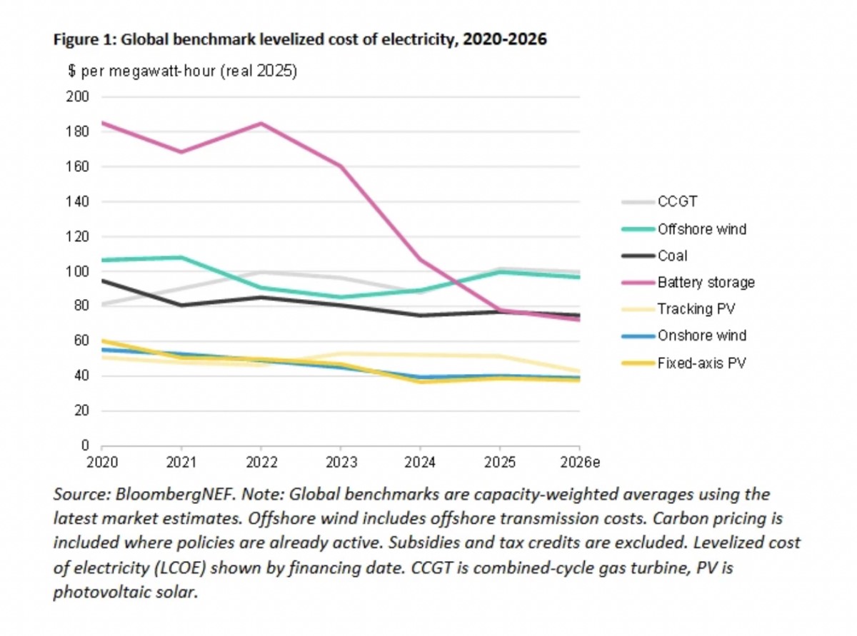 La baisse du LCOE des projets de batteries l’an dernier s’explique par la diminution des prix des packs, l’intensification de la concurrence entre fabricants et l’amélioration de la conception des systèmes. BNEF prévoit une nouvelle baisse de 25 % du LCOE du stockage par batteries au cours de la prochaine décennie.