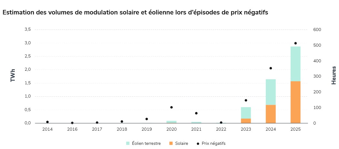 Le volume de modulation des parcs solaires et éoliens en 2025 lors d’épisodes de prix spot négatifs a doublé par rapport à l’année précédente, atteignant environ 3 TWh dont 1,3 TWh de production éolienne terrestre et 1,6 TWh de production solaire. C’est ce qui ressort du bilan électrique 2025 publié par le gestionnaire du réseau de transport d’électricité RTE ce 25 février.