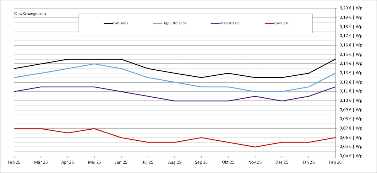 Dans le monde, les prix ont augmenté plus fortement que prévu dans toutes les catégories de modules photovoltaïques. La plupart des produits ont vu leur prix croître d’environ 0,01 €/W pour atteindre 0,015 €/W. Les modules destinés aux petits systèmes résidentiels sur toiture ont enregistré des hausses plus importantes que ceux destinés aux projets à grande échelle. Les prix ont dépassé les niveaux de janvier 2025 et se situent désormais 15 à 18 % au-dessus du point bas de décembre 2024.