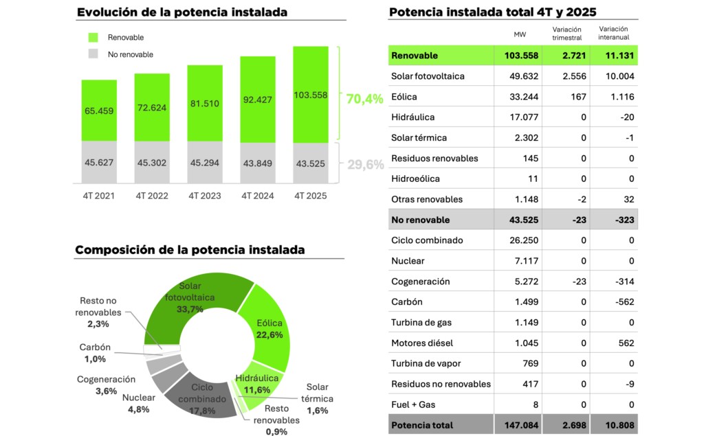 À la fin de l’année 2025, la puissance renouvelable installée en Espagne atteignait 103 558 MW, soit 70,4 % du parc de production national, situé à 147 084 MW. Sur ce total, le photovoltaïque se consolide comme première technologie renouvelable par puissance installée, devant l’éolien, qui a ajouté 167 MW pour atteindre 33 244 MW. Parallèlement, les technologies non renouvelables poursuivent leur recul, notamment la cogénération, qui a perdu 23 MW au cours du trimestre, pour s’établir à 5 272 MW.