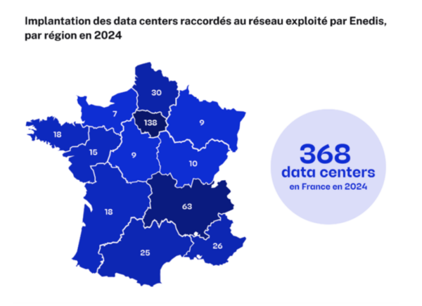 En France, la consommation d’électricité des centres de données est estimée entre 4 et 6 TWh en 2023, soit 1 à 1,5 % de la consommation nationale, selon les données du Service des statistiques du ministère de la Transition écologique. Environ 460 centres de données consommant plus de 1 GWh par an ont été recensés sur le territoire, avec une demande en forte progression ces dernières années. À plus long terme, certains scénarios anticipent une multiplication par près de quatre de cette consommation d’ici 2035.