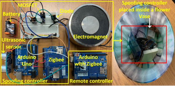 Pour démontrer cette vulnérabilité, son équipe a mis au point un dispositif expérimental à très bas coût, d’environ 45 dollars (près de 42 €). Celui-ci repose sur des composants accessibles : une carte Arduino Uno, quelques MOSFET, un module radio Zigbee, un capteur ultrason et des batteries. « Il s’agit d’une combinaison assez simple de traitement du signal et de contrôle électronique », résume Mohammad Al Faruque.