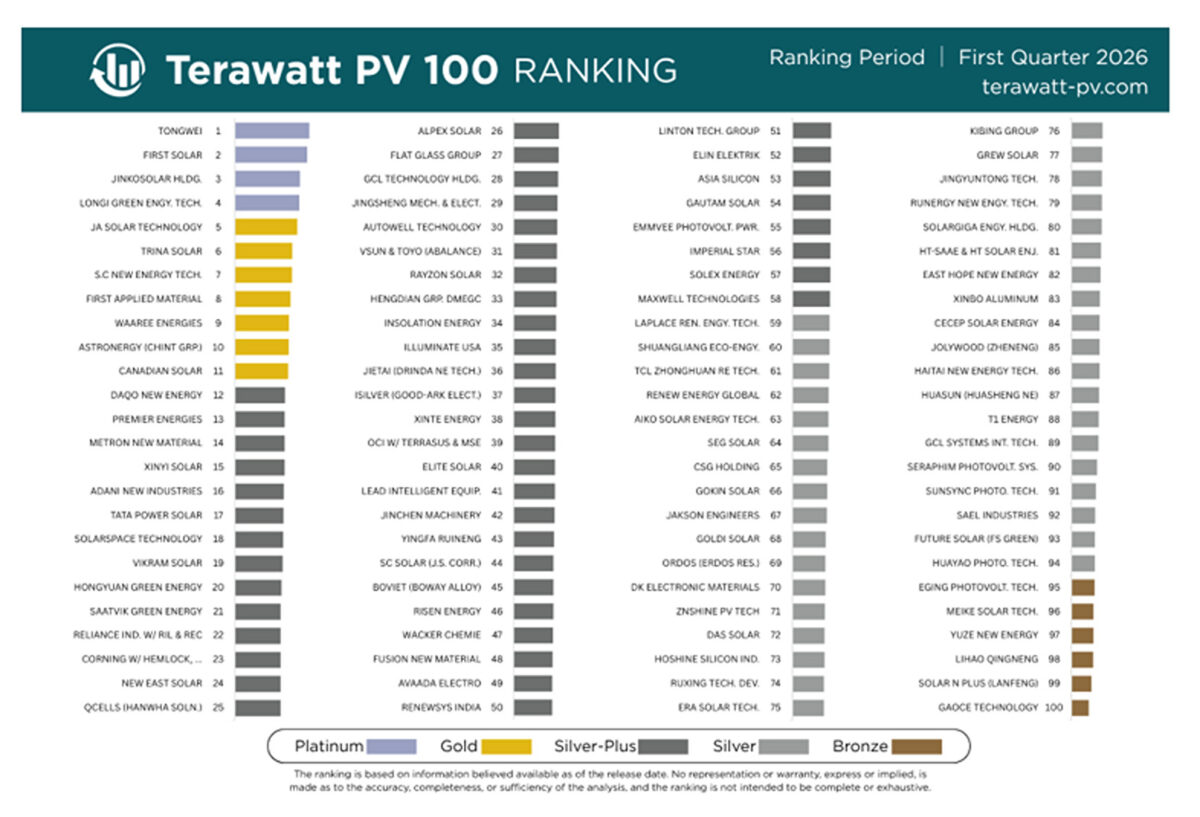 Quatre entreprises obtiennent la note maximale « Platinum » : Tongwei, First Solar, Jinko Solar et Longi. Sept autres sont classées « Gold » : JA Solar, Trina Solar, S.C New Energy, First Applied, Waaree, Astronergy et Canadian Solar.