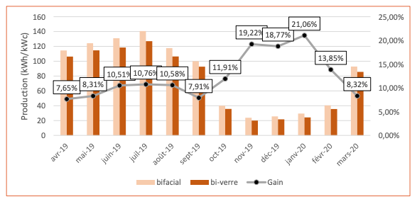 Lorsque l’on analyse les données mensuelles, on constate que le gain bifacial est plus élevé pour la période hivernale avec des valeurs aux alentours de 20%.