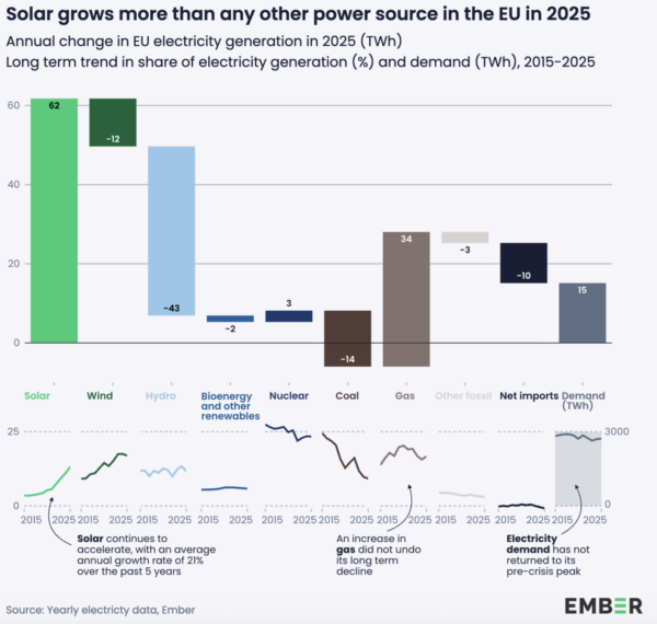 Cette trajectoire de croissance, soutenue par l’ajout de 65,1 GW de capacités solaires dans l’UE l’an dernier, a permis au solaire d’atteindre une part record de 13 % de la production électrique européenne en 2025, dépassant ainsi le charbon et l’hydroélectricité. Tous les États membres ont enregistré une progression de leur production solaire d’une année sur l’autre, la Hongrie arrivant en tête avec une contribution du solaire atteignant 28 % de son mix électrique. À Chypre, en Grèce, en Espagne et aux Pays-Bas, la part du solaire a également dépassé 20 %.