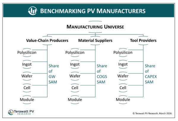 La méthodologie du Terawatt PV 100 repose sur l’évaluation des entreprises selon trois critères : l’échelle de production, la solidité financière et la transparence. L’évaluation de la production repose sur une approche inédite, considérant l’ensemble du secteur comme un marché unique. Elle intègre à la fois les fabricants de composants, les fournisseurs de matériaux et les équipementiers.