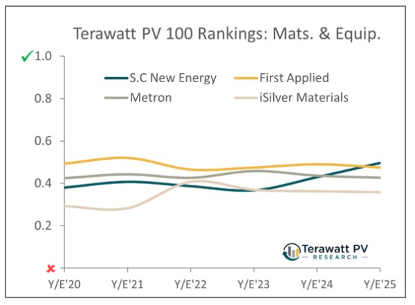 Les entreprises chinoises représentent près de 60 % du classement, tandis que First Solar et Waaree sont les seules sociétés non chinoises présentes dans le top 10. S.C New Energy est l’entreprise d’équipements la mieux classée, tandis que First Applied domine le segment des fournisseurs de matériaux.