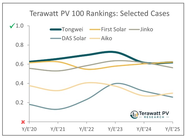 Quatre entreprises obtiennent la note maximale « Platinum » : Tongwei, First Solar, Jinko Solar et Longi. Sept autres sont classées « Gold » : JA Solar, Trina Solar, S.C New Energy, First Applied, Waaree, Astronergy et Canadian Solar.