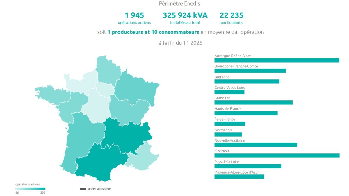 Selon les derniers chiffres publiés par le gestionnaire du réseau de distribution Enedis, la France comptait à la fin du premier trimestre 2026 1 945 opérations d’autoconsommation collective (ACC), soit 325 924 kVA installés au total. Les opérations regroupent 22 235 participants, soit un producteur et 10 consommateurs en moyenne par opération.