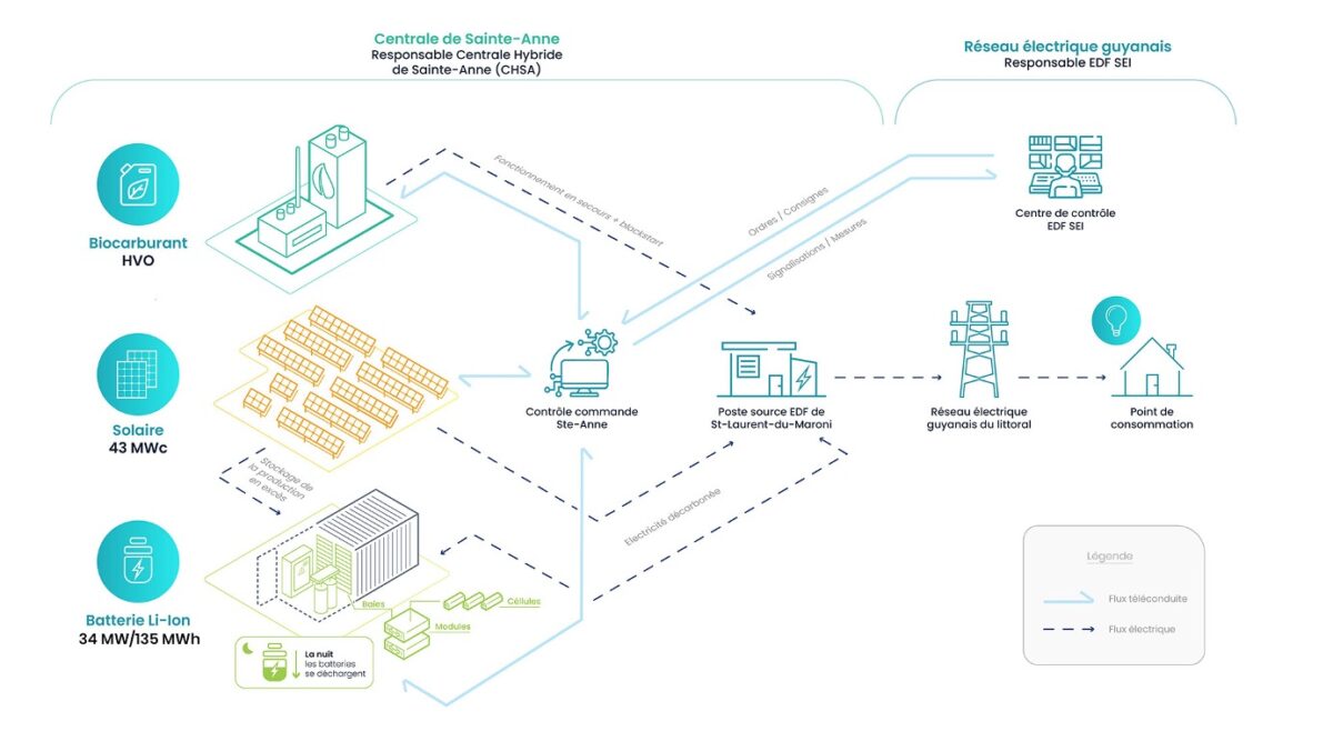 Le projet de centrale hybride de Sainte-Anne est implanté sur un site de 64 hectares, sur la commune de Mana, dans l’ouest guyanais, à 12 km de Saint-Laurent-du-Maroni. L’installation associe 43 MW de panneaux photovoltaïques à un système de stockage par batteries lithium-ion de 34 MW, pour une capacité de 135 MWh. En complément, sept groupes électrogènes de 7 MWe fonctionnant au biocarburant HVO (issu du recyclage d’huiles végétales) interviendront uniquement en secours, afin de garantir la fiabilité de l’approvisionnement électrique.